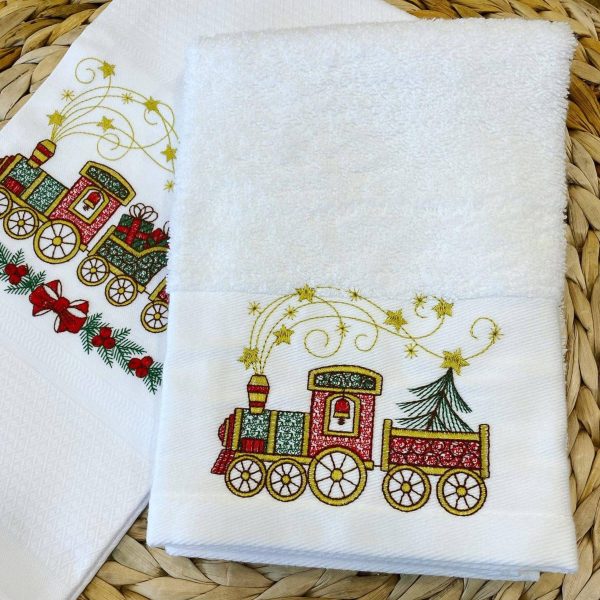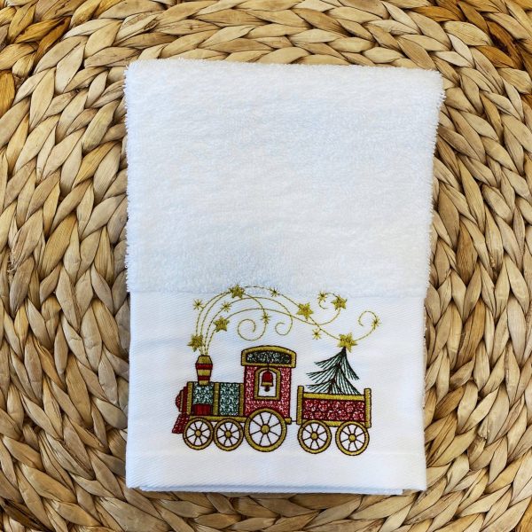 Pano de cozinha branco com bordado de comboio ao centro da barra.
