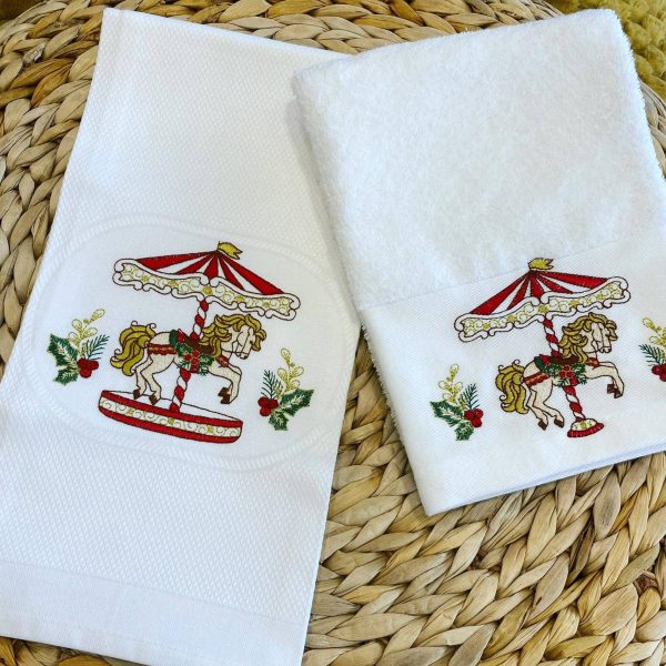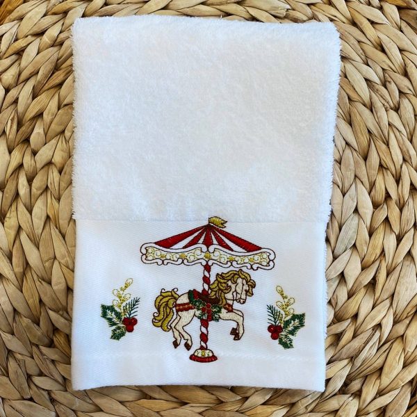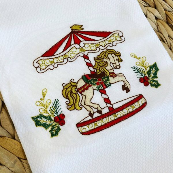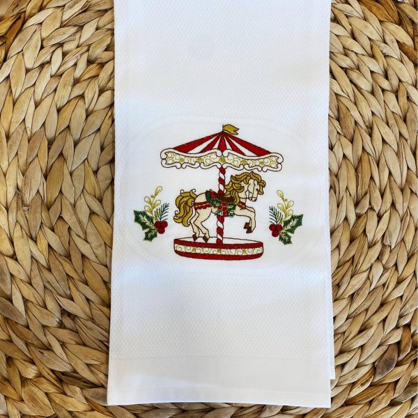 Pano de cozinha turco branco com bordado de cavalinho ao centro da barra.