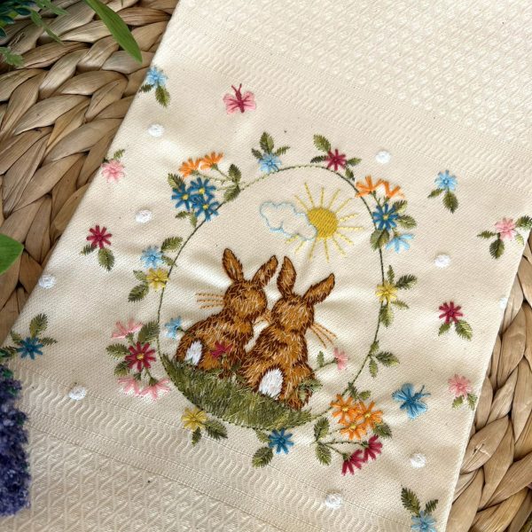 Pano de cozinha em tela bege com bordado de coelhos e flores centro da barra.