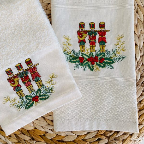 Pano de cozinha bege com bordado de Soldadinhos ao centro da barra.