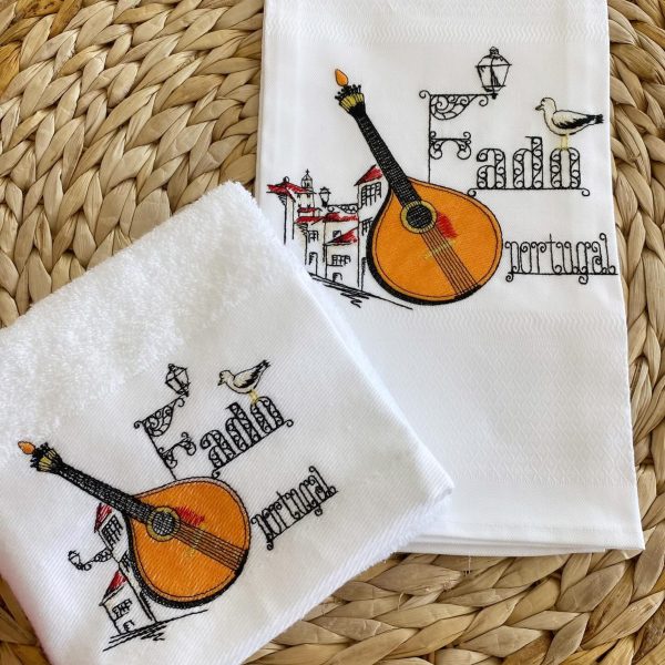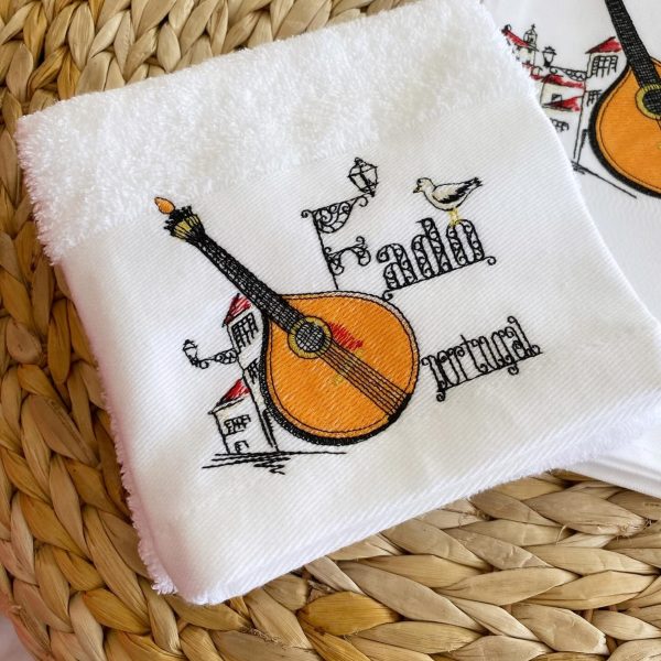 Pano de cozinha em turco branco com bordado de Guitarra Portuguesa ao centro da barra.
