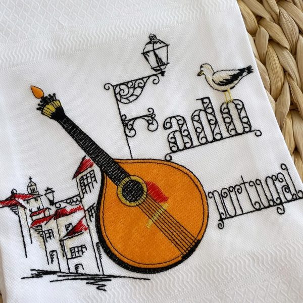 Pano de cozinha em tela branco com bordado de Guitarra Portuguesa ao centro da barra.