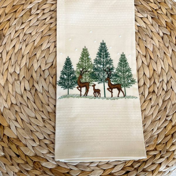 Pano de cozinha bege com bordado de renas e árvores.
