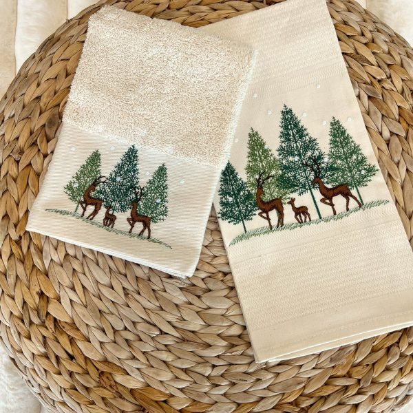 Pano de cozinha em felpo bege com bordado de renas e árvores.