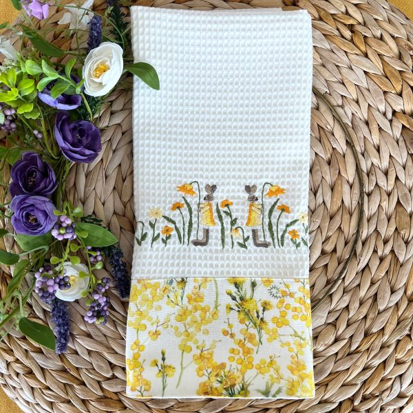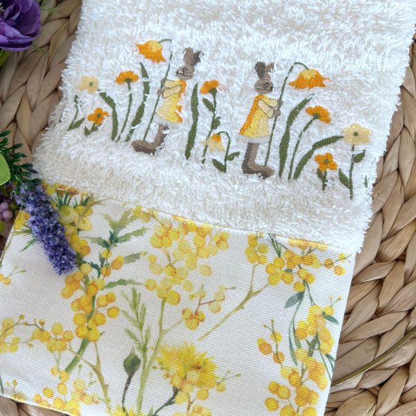 Pano de cozinha em favo bege com bordado de coelhos e flores ao centro e aplicação de barra em tecido floral amarelo.