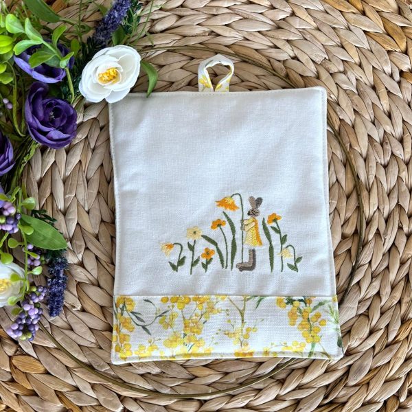 Pantufas em tecido estampado rosa com aplicação de laço atrás na barra branca. São todas forradas em malha jersey.