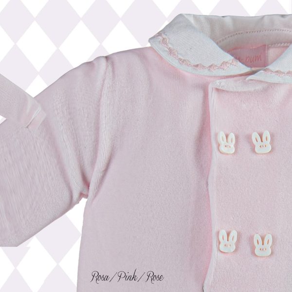 Babygrow laminado (veludo) rosa com aplicação de 4 botões em forma de coelho na frente. Tem gola redonda com bordado.