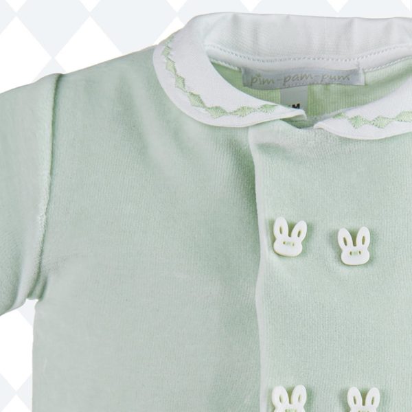Babygrow laminado (veludo) verde com aplicação de 4 botões em forma de coelho na frente. Tem gola redonda com bordado.
