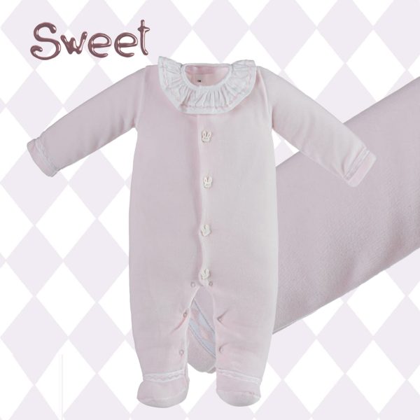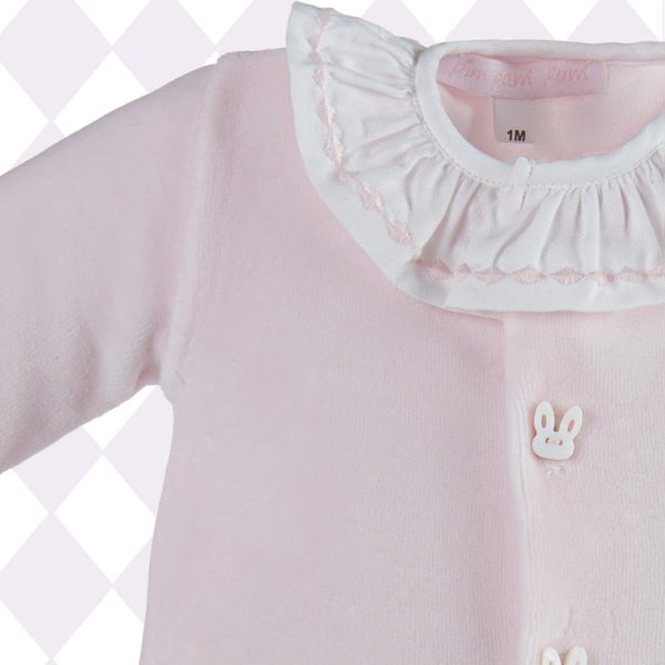 Babygrow laminado (veludo) rosa com aplicação de botões em forma de coelho na frente. Tem gola branca franzida com bordado rosa.